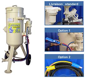 Ref - 1005 - Désignation - Sableuse 50 litres avec: - (A) Filtre décanteur réf.1320 + (B) Doseur abrasif réf.1520 - Option 1: CAD réf.1250 + jumelé 5m réf.8224 + poignée réf.1200 - Option 2: Lance 5m réf.8003 + Buse ø 5 réf.7250