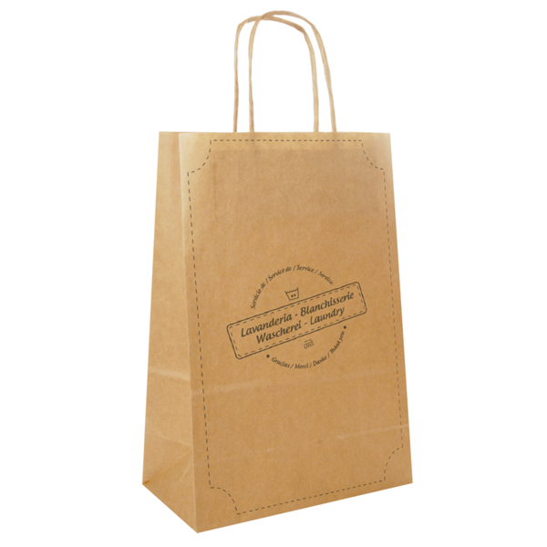 Sac à poignées torsadéesSoufflets latérauxSoufflet de fond (SF)Recyclable (suivant filière)BiodégradableSac conçu pour la collecte du linge sale en hôtellerieSolution écologiqueMatière : KraftColoris : NaturelGrammage : 90 gr/m2Impression : "Blanchisserie" Dimensions nominales : 320x160x430 mmDimensions apparentes : 320+80+80 (=480) x 430+1/2 SF 80 (=510) mm Vendu au carton de 250 sacsDélai : nous consulter