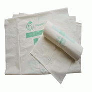 Sacs type poubelle pour déchets verts, organiques Norme : EN 13432 (Compostage industriel) Matière : Compostable - blanc Dimensions : 680x820 mm Epaisseur : 28 microns Litrage : 60 litres Impression : Oui - logo EN13432 Fermeture par lien dans le soufflets Ces sacs s'adaptent facilement à