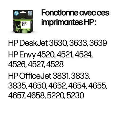 HP 302XL Cartouche d'Encre Noire grande capacité Authentique - Imprimantes compatibles : - HP DeskJet : 1110, 2130, 2132, 2134, 2136, 3630, 3632, 3633, 3634, 3635, 3636, 3637, 3638, 3639 - HP ENVY : 4520, 4521, 4522, 4524, 4525, 4526, 4527, 4528 - HP OfficeJet : 3830, 3831, 3832, 3833, 3834, 46