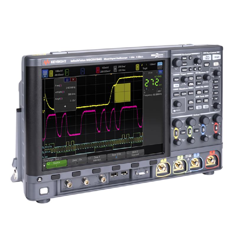 L'oscilloscope numérique Keysight DSOX3104G permet la visualisation des formes d'ondes avec une bande passante de 1 GHz, une fréquence d'échantillonnage maximal de 5 Géch/s, une résolution de 8 bits et un taux de rafraîchissement supérieur à 1 million de formes d'ondes par seconde. - Il dis