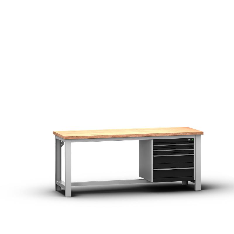 Etabli avec Ossature Cubio Mpx Avec Armoire 4 Tiroirs LxPxH: 2000x750x840mm Établi à ossature cubio avec armoire à 4 tiroirs. Composée d'une ossature à profilé en acier pour charge lourde, cadre avec plateau en bois multiplis de 40 mm d'épaisseur. Taille de l'armoire - LxPxH : 650x650x600 mm. Configuration de tiroir : 2x 75mm, 1x 150mm, 1x 200mm avec glissières à extension de 100 % (charge uniformément répartie de 75 kg). Finition en revêtement poudre durable. LxPxH : 2000x750x840 mm.