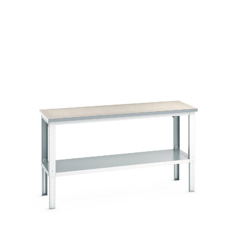 Établi avec Ossature Réglable Cubio Lino avec Demi Tablette - Caractéristiques principales : - Établi à ossature Cubio à hauteur réglable - Tablette inférieure à mi - profondeur - Ossature à profilé en acier pour charge lourde - Plateau en lino de 40 mm d'épaisseur - Finition en re