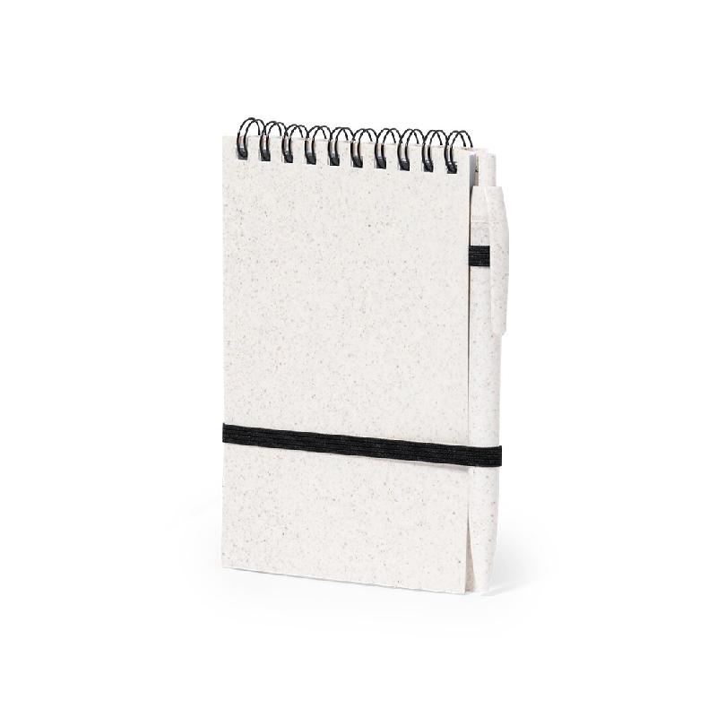 Bloc-notes à anneaux avec couvertures en paille de blé et stylo assorti, également en paille de blé. Format compact, avec élastique de fermeture en élégante couleur noire. Comprend 70 feuilles à disposition lignée et design éco. Stylo à mécanisme poussoir en paille de blé avec encre bleue. Inclut un insigne Wheat Straw. Présenté dans une pochette individuelle recyclée.10 X 14 X 1.5 Cm | 88 Gr.
