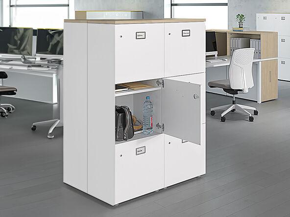 Armoire à deux colonnes avec 6 compartiments verrouillables, fabriquée en mélaminé de 19 mm. Livrée pré-assemblée, avec options de personnalisation et garantie de trois ans.