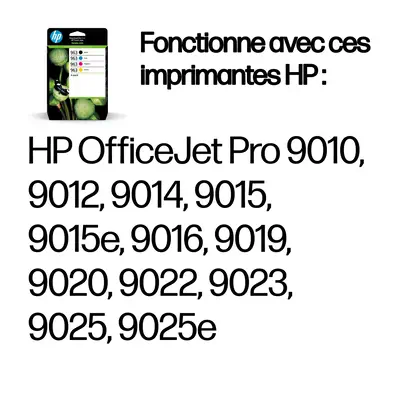 Vous pouvez compter sur des documents de qualité professionnelle. Les cartouches d'encre HP authentiques assurent une fiabilité impressionnante, des performances optimales, des rendements de pages homogènes et des résultats durables.[1] Imprimez des documents commerciaux qui combinent couleurs éclatantes et texte noir net. Gagnez du temps et de l'argent lorsque vous achetez un ensemble complet d'encres en un seul pack pratique.[2]