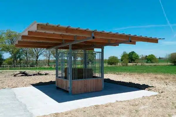 Cet abri en bois Douglas est conçu pour offrir un espace de nourrissage abrité à vos chevaux ou bovins. Sa structure solide et ses équipements intégrés assurent confort et sécurité.