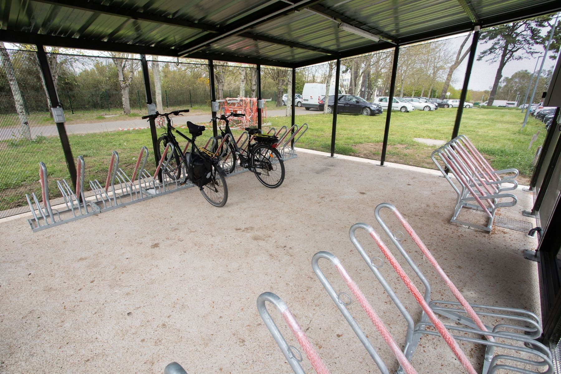 Abri vélo fermé et sécurisé par digicode manuel - Toiture lumineuse en voute transaparente - Grillage en acier galvanisé et soudé - Dimensions : L 4525mm x l 2811mm x h 2510mm - Sécurisé par un digicode manuel + grillage en mailles de 100×50 - Racks à vélos 9 places, adaptés aux cad