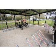 Abri cycles sécurisé pour le rangement et une protection maximale des vélos, trottinettes, scooters et motos. Ses poteaux et son grillage en acier galvanisé font de cet abri une solution efficace et durable pour réduire le risque de vol des deux roues. Le renfort latéral de la toiture voûte a