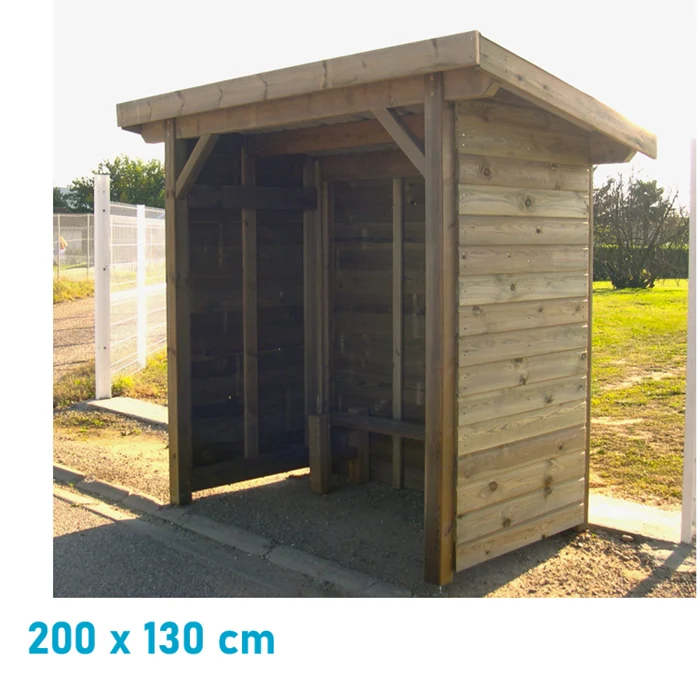 Abri voyageurs en pin traité classe IV sans Cuivre, Chrome ni Arsenic.Caractéristiques : - Panneau prémonté avec paroi en clin épais de 21 mm traité autoclave classe III sans C.C.A. - Cadre section : 68 x 45 mm. - Toiture : tôle ondulée coloris tuile orangée, à visser sur structure avec