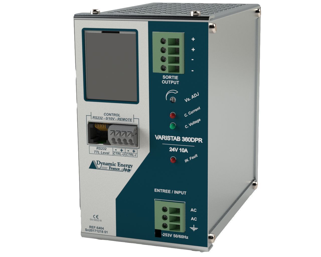 Alimentation programmable par RS232 ou 0 - 10V - ENTREE: 90VAC à 253VAC - Protection par fusible en interne - TENSION DE SORTIE: 24VDC 20A - Protection contre les C.C par courant constant - Affichage U/I et autres paramètres sur afficheur graphique - PUISSANCE: 480W