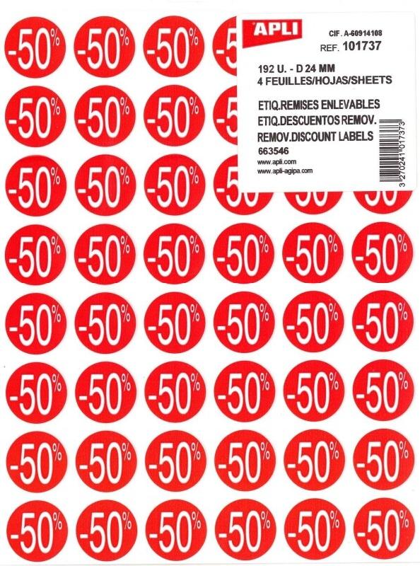 Apli Lot de 10 192 étiquettes adhésives avec taux de remise "-50%", diam. 24mm - 3270241017373