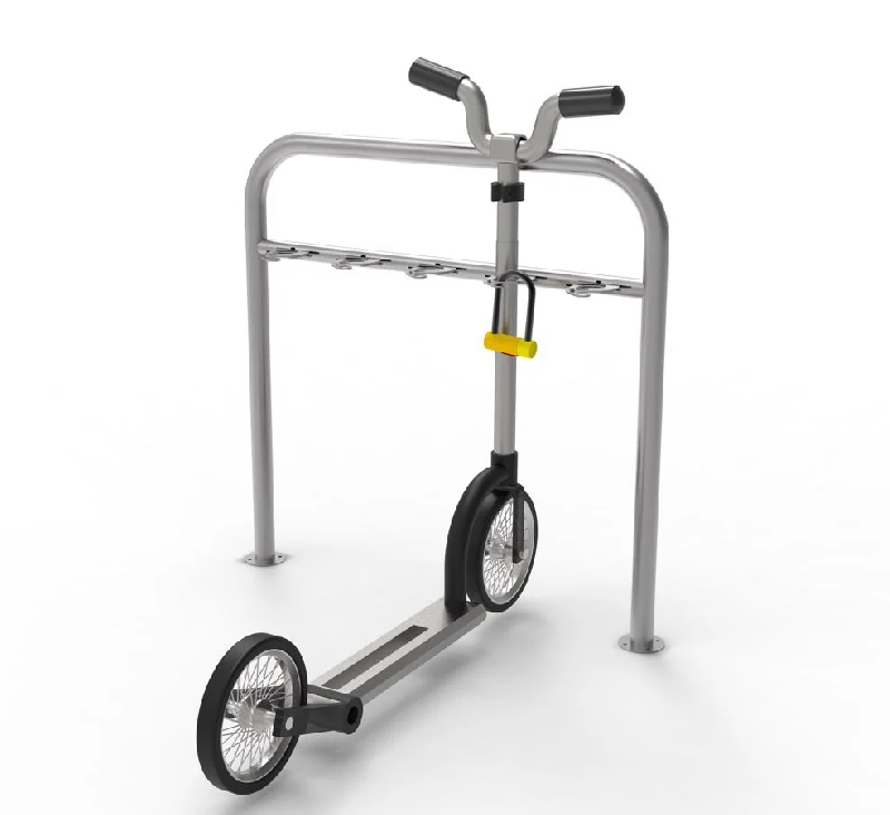 Informations complémentaires - Système : blocage et déblocage automatique du guidon, anneaux de verrouillage (cadenas non fourni). - Nombre de trottinettes : 5 - Finition : Structure tubulaire inox brossé 304 - Tarifs sur demande - 316 L - Fixation : Sur platine - Diamètre : 48mm - Conv