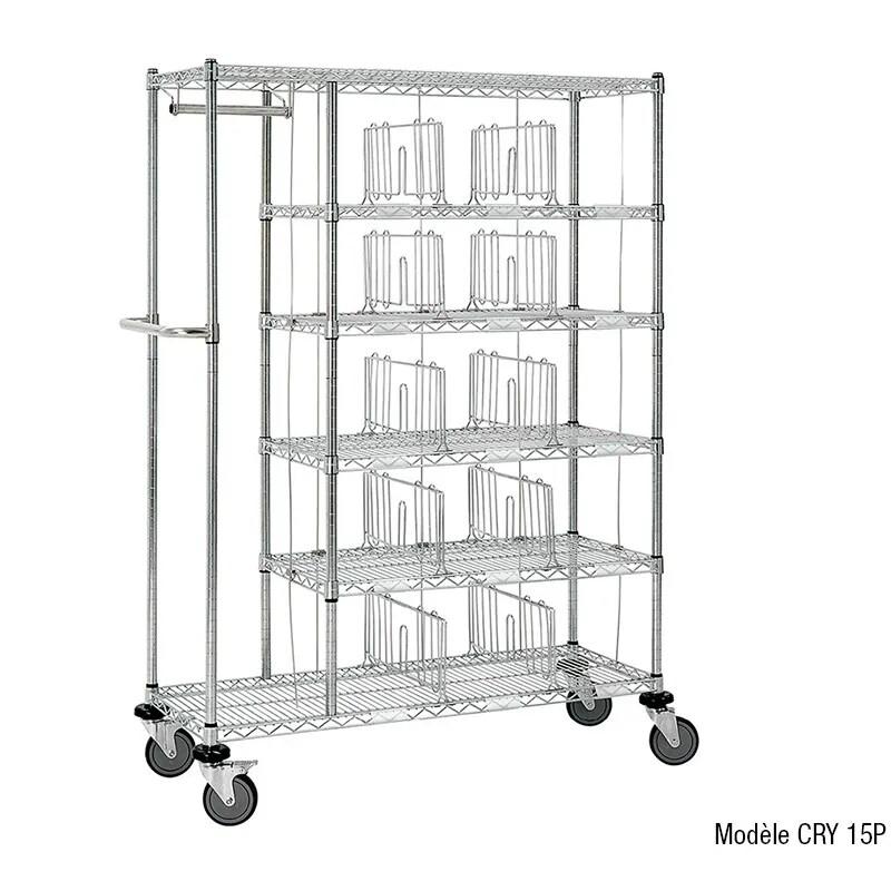 CHARIOT À CASIERS ET PENDERIE - 15 casiers / penderie 610 mm - Dimensions : L.1 520 x P.457 x H.1 780 mm - Matériau : Construction en tube et fil d’acier chromé de très haute qualité - Montage : Facile, rapide et sans outil - Charge utile : 250 kg par étagère - Mobilité : Grande mani
