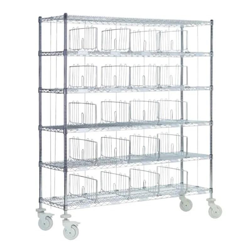 CHARIOT À CASIERS ET PENDERIE - 15 casiers / penderie 610 mm - Dimensions : L.1 520 x P.457 x H.1 780 mm - Matériau : Construction en tube et fil d’acier chromé de très haute qualité - Montage : Facile, rapide et sans outil - Charge utile : 250 kg par étagère - Mobilité : Grande mani