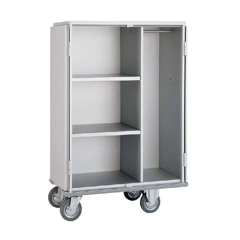Chariot armoire pour linge propre avec 2 battants + 1 penderie, étagères, serrure à clef et frein sur une roue pivotante (883L).