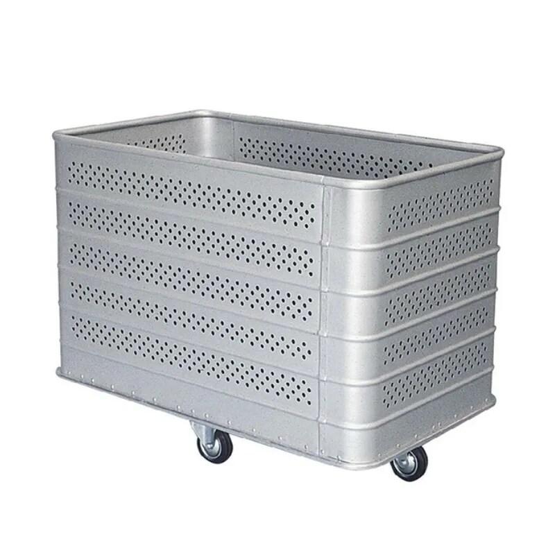 Ariane Chariot de manutention blanchisserie perforé, capacité 428L, en alliage léger anodisé, avec parois nervurées perforées et 4 roues en caoutchouc.