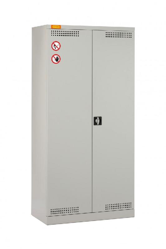 Armoires de sécurité 2 portes pour produits inflammables avec système d'extinction automatique au CO2, d'une capacité de rétention totale de 72 L. Elle est en acier 9/10è, simple paroi, avec ventilation naturelle et munie d'une cartouche de CO2 de 300g. - Caractéristiques : - Dimensions (H