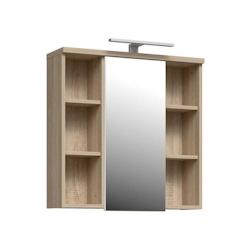 Avantages du produit : Armoire murale compacte et moderne optimisant le rangement en salle de bain. Porte avec miroir intégré pour un gain de fonctionnalité, éclairage LED intégré pour une meilleure visibilité et six niches ouvertes pour organiser cosmétiques et accessoires. Finition décor chêne Sonoma apportant une touche chaleureuse.Recommandations d'utilisation : Suspendre au mur à l'aide des points de fixation pré-percés. Idéale pour ranger produits de soin, brosses et petits accessoires dans une salle de bain compacte. Ne pas surcharger les étagères au-delà de leur capacité raisonnable.Conseils d'entretien : Nettoyer avec un chiffon doux et sec ou légèrement humide. Éviter les produits abrasifs et l'excès d'eau pour préserver la finition décor bois. Vérifier régulièrement les fixations murales.Accessoires compatibles : Organiseurs de petites boîtes, porte-brosses et distributeurs de savon adaptés aux étagères.Données techniques :