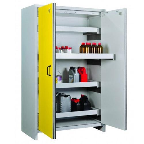 Armoire anti-feu dédiée au stockage de produits inflammables dans les lieux de travail, conformément au code du travail. Fabriquée selon la norme EN 14470-1 et répondant aux exigences de la norme EN 14727 . Résistance au feu : Résistance au feu de 30 minutes. Construction en panneaux ignifugés mono-paroi insensibles à l'humidité et résistants à la plupart des acides et bases, haute stabilité chimique. Fermeture automatique des portes au-delà de 50°C. Ferme-porte hydraulique. Chaque porte est équipée de sa serrure fermeture 1 point avec jeu de 2 clés. 4 tiroirs coulissants. Raccord de ventilation pour aération entrante et sortante.…