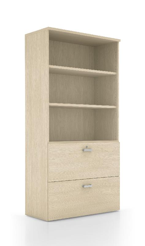 Le classement et l'archivage sont primordiaux pour le travail de tous les jours dans le bureau, c'est pourquoi nous vous proposons ici une déclinaison du programme de rangement de notre partenaire Mobel Linea qui comprend une partie haute type bibliothèque et d'une partie basse avec tiroirs destinés aux dossiers suspendus.