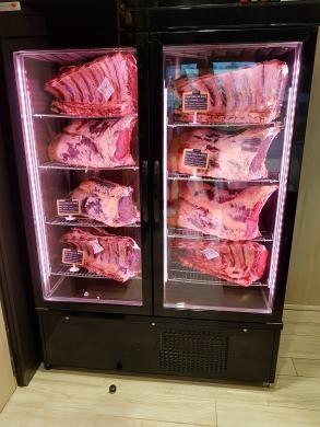 Température de fonctionnement : - 2°C à +8°C. - Capacité de stockage: 55Kg de viandes. - Armoire de maturation pour viandes 1 porte vitrée. : - Extérieur en acier inox plastifié noir (sauf partie arriére). - Intérieur en acier inox AISI - 304 avec fond embouti. - Humidité comprise e