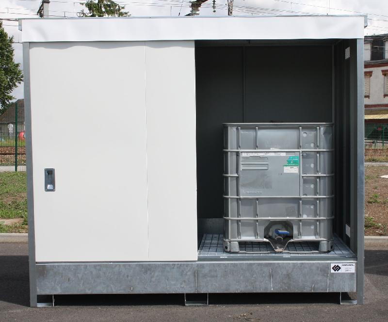 Armoire de stockage en acier galvanisé - Capacité : 1 conteneur de 1000 L - Finition : Acier galvanisé (ne convient pas aux produits corrosifs sans l'option protection intérieure du bac de rétention) - Dimensions intérieures : Largeur 1400 mm x Profondeur 1300 mm x Hauteur 1250