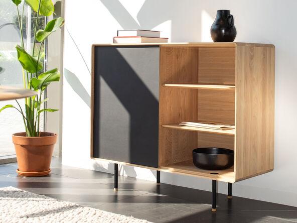 Armoire en bois avec porte Fina Gazzda. Structure en chêne massif. Porte linoléum. Pieds acier thermolaqué. Dimensions L118 x P45 x H100 cm. Bois provenant de forêts certifiées FSC. Bosnie.