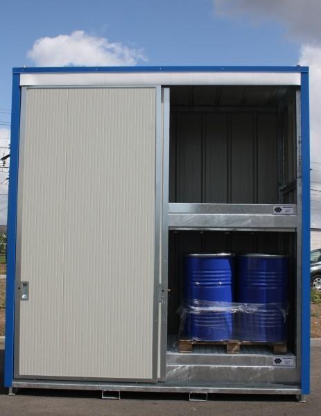 Capacité de stockage : 16 fûts de 220 l ou 4 conteneurs de 1000 litres