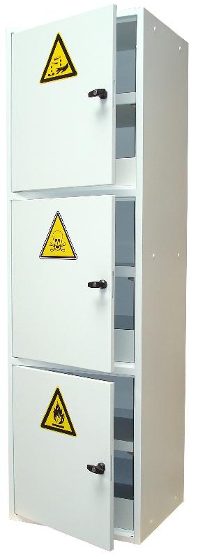 Armoire de sûreté modulable, juxtaposable, pour produits chimiques avec 3 compartiments et 3 portes manuelles.