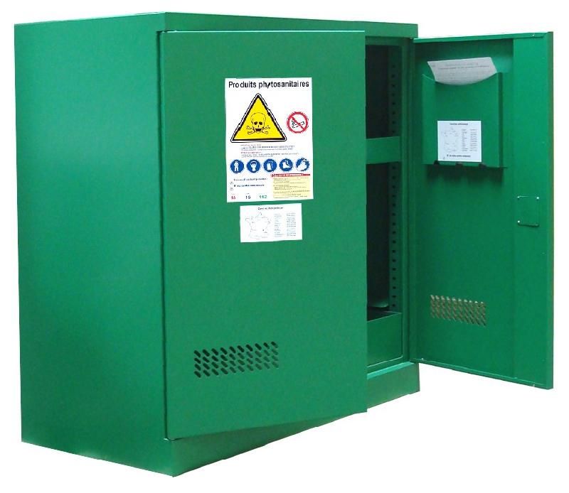 Armoires phytosanitaires selon exigences du décret 87 - 361 du 27/05/1987. - Armoires de sécurité et de sûreté - Produits Toxiques T et T+, Cancérigènes, Mutagènes, Tératogènes, Xn et Xi, Corrosifs - Ventilation haute et basse, collerettes de raccordement sur le toit - Ouverture de por