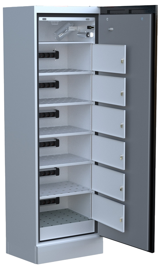 Armoire de charge lithium - ion à 7 casiers sécurisés - Résistance feu 90 min et prise se individuelleStockage actif sécurisé avec casiers individuels verrouillables Cette armoire de sécurité haute à 1 porte, équipée de 7 casiers à fermeture individuelle, est conçue pour le stockage ac