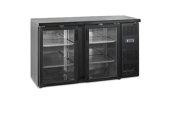 Arrière - bar 2 portes vitrées de couleur noir. - Fabriqué selon les normes C.E., construction en skin - plate de couleur noir. - Intérieur en acier inoxydable avec une finition miroir poli SS430. - Groupe incorporé, évaporateur ventilé. - Groupe logé ventilé classe climatique 4. - Ré