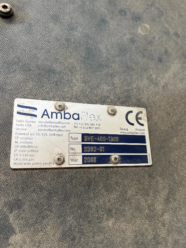 Ascenseur à bande spirale fabriqué par AMBAFLEX, modèle SVE-400-1300. Largeur du ruban 400 mm. Entrée - sortie à 90 degrés. Différence entrée - hauteur sortie de 3300 mm. Caractéristiques techniquesModèleSVE-400-1300 Année de fabrication2006 DimensionsLARGEUR DU RUBAN400 mm Informations pour le transportLongueur2000 mmLargeur2000 mmHauteur3800 mmÉtatDans son étatFabriqué parAMBAFLEX