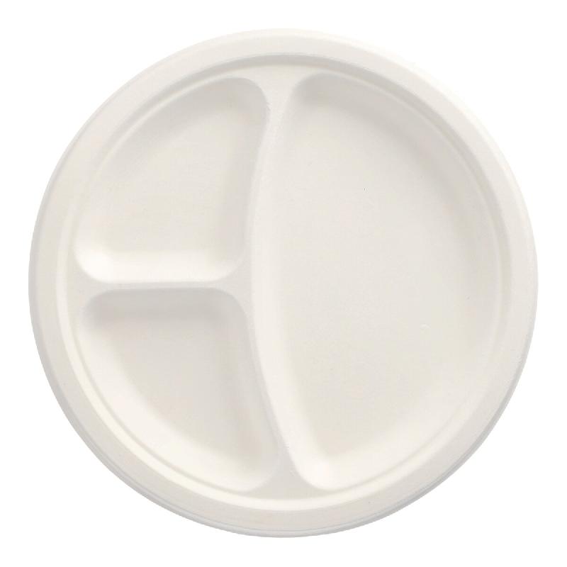 Assiettes en canne à sucre "pure" 3 compartimentsCARACTÉRISTIQUES DU PRODUIT : - Diamètre : 23 cm - Hauteur : 2 cm - Matière : canne à sucre - Couleur : blanc - Température d'utilisation maximale : de - 25°C à +130°C - Passe au micro - ondes jusqu'à 800 W (maximum 2 minutes)PRODUIT STANDA