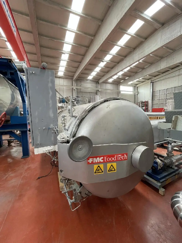 Stérilisateur A144 fabriqué par FMC FOODTECH Pression de service maximale < /th> 4 bars Pression d'essai 5,72 bars Pression de la soupape de sécurité 4 bar Température maximale de fonctionnement 205 ºC Conditions de vapeur min. 6 bars/max. 7,5 bar Conditions d'air min. 5,5 bars/max. 6,5 bar Conditions d'eau de refroidissement min. 3 bars / max. 5 bars Capacité 6820 L