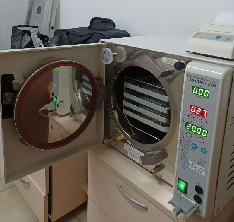 Autoclave fabriqué par TAU STERIL, modèle TAU CLAVE 3000. Pompe à vide pour le séchage. Géré par un microprocesseur.