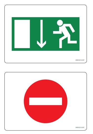 Le pictogramme "sens interdit" est côté adhésif. Le pictogramme issue de secours comporte une flèche vers le bas.