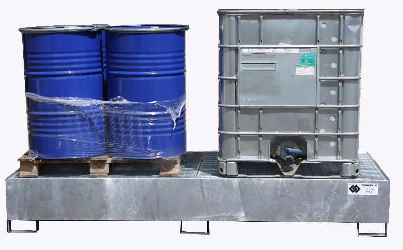 Réference : BRAG 2 CM - Bac de rétention avec caillebotis amovibles en acier galvanisé, pour le stockage en rétention deux cubitainers ou deux cuves IBC. - Idéal pour le stockage de tous les produits polluants ou inflammables : hydrocarbures, solvants et tous les produits non corrosifs. - S