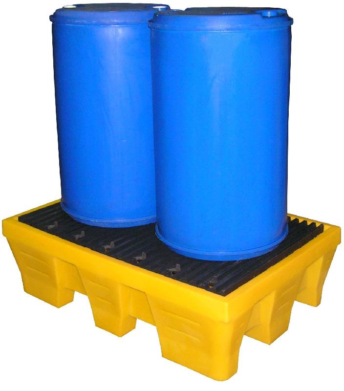 Référence : BRPN 2F Caractéristiques : - Palette de rétention en polyéthylène (PEHD) munie de caillebotis amovibles, pour le stockage en rétention de deux fûts de 220 litres debouts. - Idéal pour le stockage des produits chimiques (acides, bases ...) et corrosifs. - Capacité de rétenti
