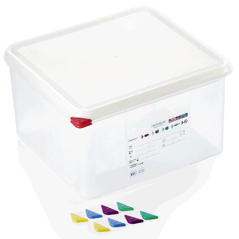 Bac GN 1/1 polypropylène H 100 mm 13,7 ltr avec couvercle GN 86 lot de 6 - Was GermanyCe couvercle répond aux exigences des professionnels de la restauration et des métiers de bouche avec rigueur.Couvercle à fermeture hermétique. Y compris 5 clips de marquage dans les couleurs : rouge, bleu, j