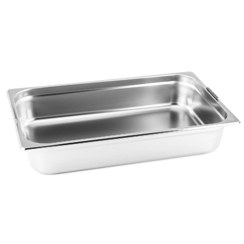 Bac GN 1/1 65mm avec poignées tombantes - Matériau : acier au nickel - chrome - volume de remplissage 9 litres - inoxydable - résistant à l'acide et neutre au goût - convient au lave - vaisselle - conforme à la norme européenne 631 - avec 2 poignées auto - rétractables - avec bord d