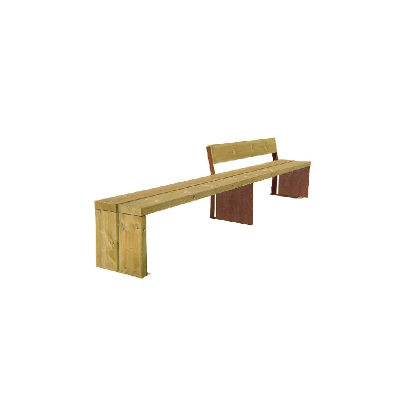 . Piètements en tôle d'acier CORTEN - . Lattes 210 x 58 mm en bois traité autoclave classe 4 - . Visserie Inox - Dimensions: 1850 x 440 x 440 mm - Hauteur de l' assise: 440 mm - Fixation par ancrage préconisée - Référence : ME - SIMP - 311