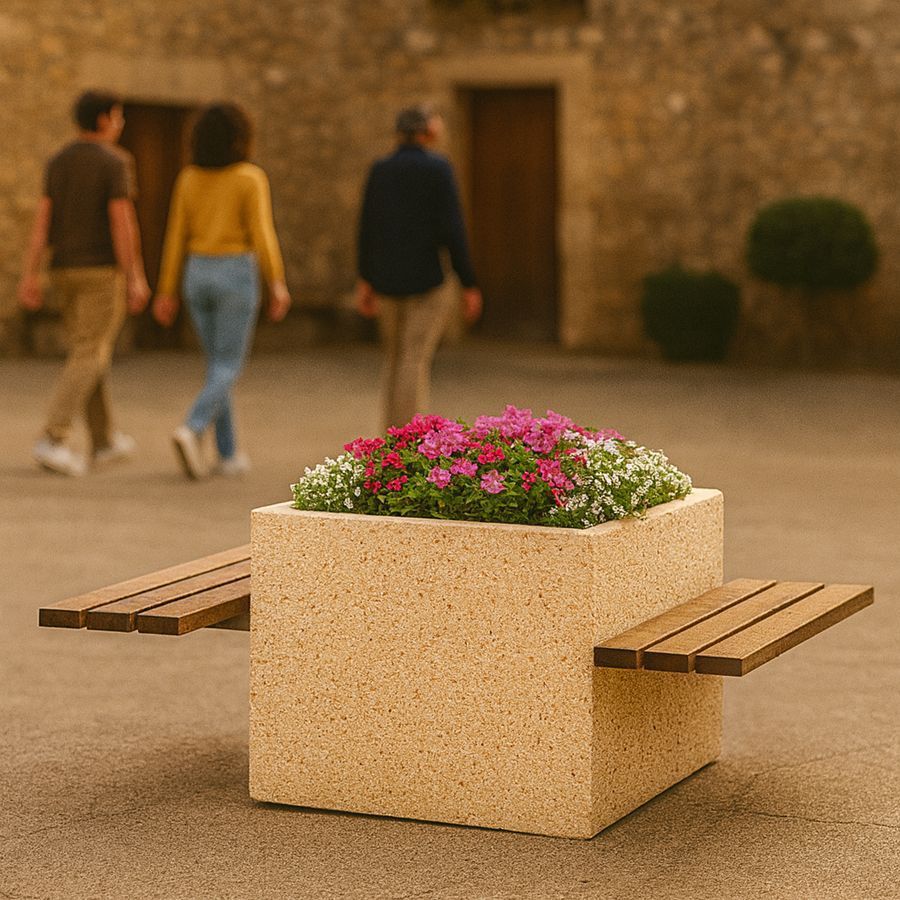 Jardinière banc urbaine alliant esthétique et praticité : Structure en béton robuste et durable, idéale pour délimiter les espaces publics. Assise en bois intégré, offrant un lieu de repos convivial. Design moderne et naturel, valorisant les espaces verts tout en favorisant la convivialité. Résistante aux intempéries, facile à entretenir, parfaite pour une ville accueillante et écologique.