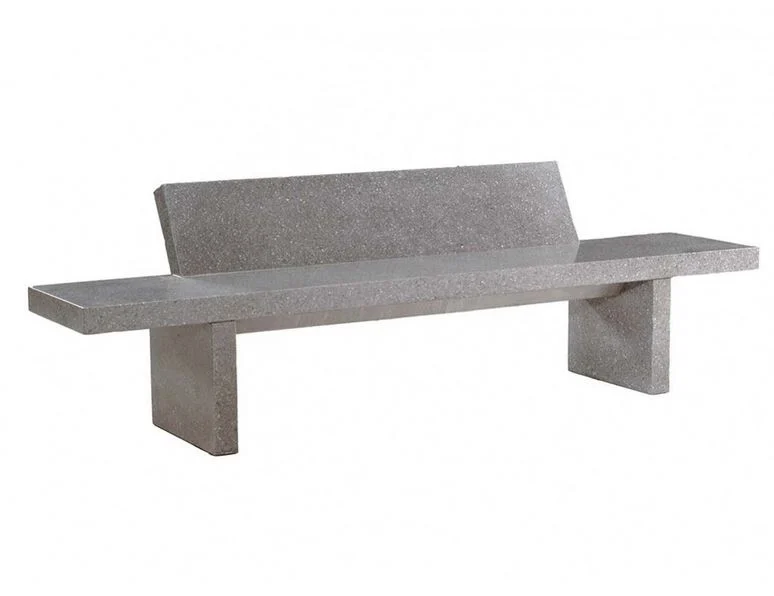 Banc en béton préfabriqué armé coloris gris granite d'aspect rugueux, poli sur la partie supérieure. - Ancrage recommandé : - Posé à terre sur ses extrémités résistantes dans le but de faciliter le nettoyage et l’entretien. -