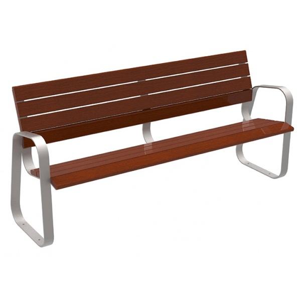 Banc Venise - Longueur : 1800 mm - Structure en acier : 450 x 450 mm, épaisseur 3 mm - Version acier et bois : assise bois exotique, 3 lames de bois de largeurs différentes, épaisseur 36 mm, dossier tout bois ou acier et bois - Version tout acier : assise et dossier en tôle -