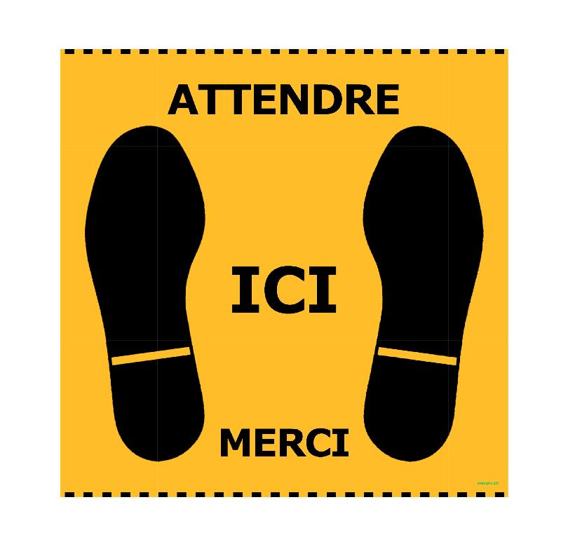 Bande adhésive de distanciation avec texte "ATTENDRE ICI MERCI" et 2 pictogrammes semelles à coller au sol - Bande adhésive de distanciation avec texte "ATTENDRE ICI MERCI" et 2 pictogrammes semelles à coller au sol - - Format 40 cm x 40 cm - - Couleur fond: jaune (par défaut), bla