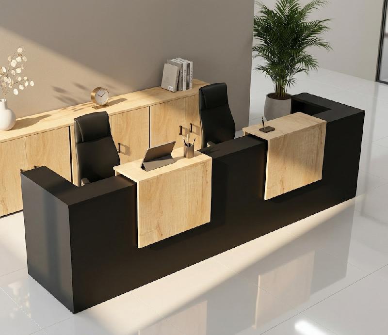 Ce comptoir de réception 2 personnes a été conçu pour résister au temps et à l'usage intensif, avec deux plateaux d'une épaisseur de 25 mm garantissant sa solidité.