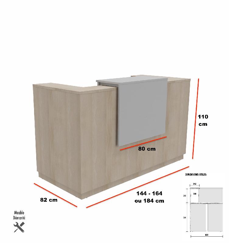 Dimensions globales : L286/306 x P112,5 x H113 cm - Plateau principal - Dimensions : 140x80 ou 160x80 cm - Hauteur : 73 cm - Épaisseur : 2,5 cm - Chant ABS droit 2 mm - Comptoir bas (accès PMR) - Largeur : 140 cm - Profondeur : 82,5 cm - Hauteur : 73 cm - Caractéristique annexes - Mati