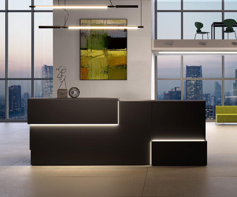 De manière unique, certaines parties de la banque d'accueil Mitis sont rétroéclairées ( option ), ajoutant une dimension supplémentaire de sophistication et créant une première impression mémorable pour vos visiteurs.